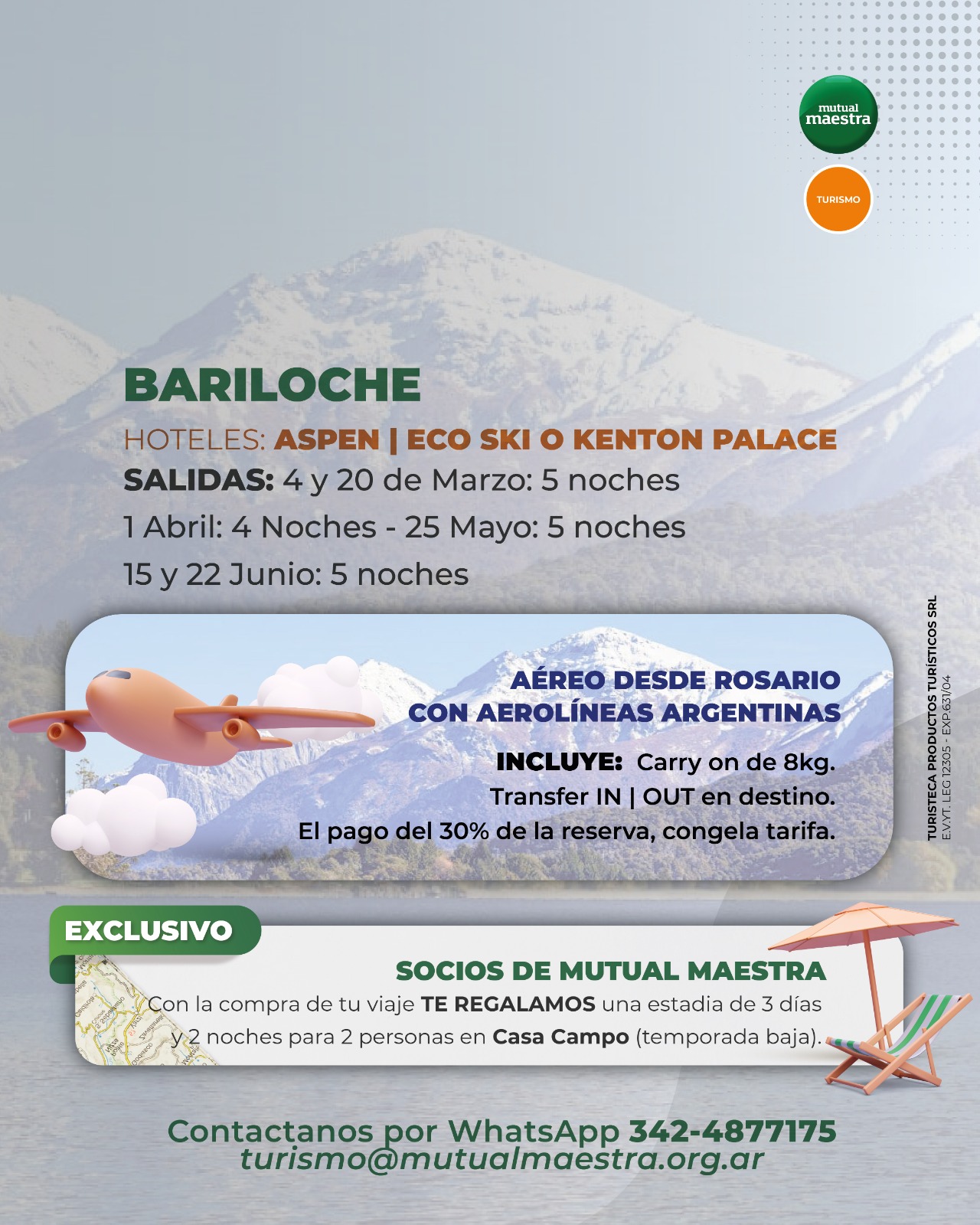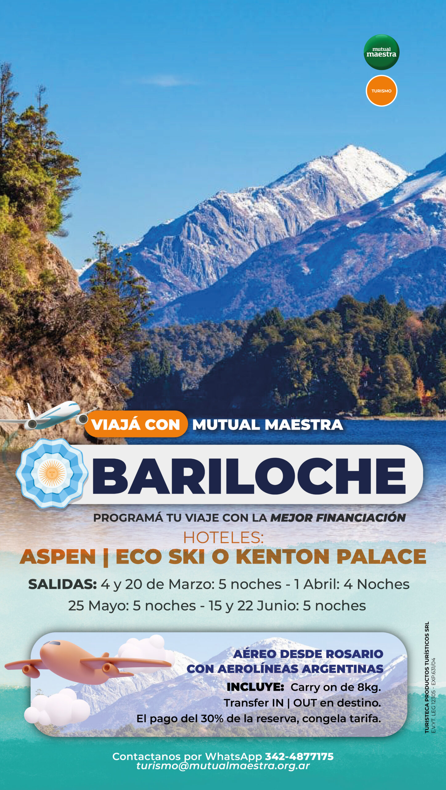 Desde Mutual Maestra te invitamos a vivir Bariloche con el respaldo de una institución que piensa en vos. Planificá tu próximo viaje con asesoramiento personalizado y propuestas diseñadas para que solo te ocupes de disfrutar. Consultá hoy mismo en Mutual Maestra y empezá a hacer realidad tu viaje a la Patagonia.