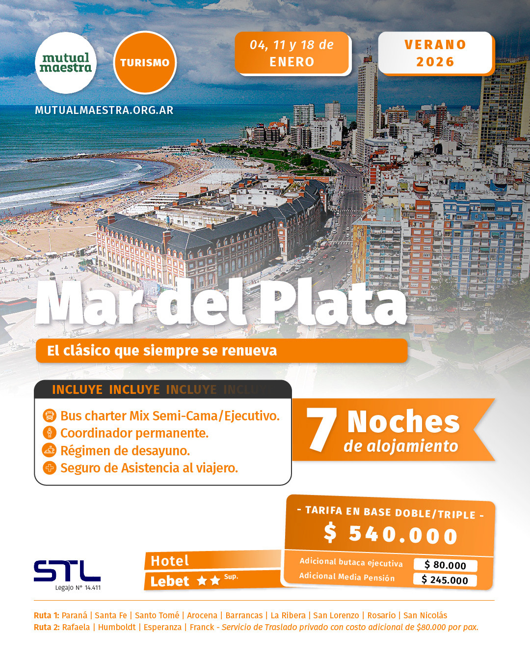 Cultura y espectáculos En verano, la ciudad se convierte en la capital del teatro argentino, con propuestas para todas las edades. Además, cuenta con museos, centros culturales y el imponente Teatro Colón marplatense. Sabores de mar No podés dejar de probar las rabas, cornalitos y mariscos frescos en los clásicos restaurantes del puerto, acompañados de la tradicional cerveza artesanal local.