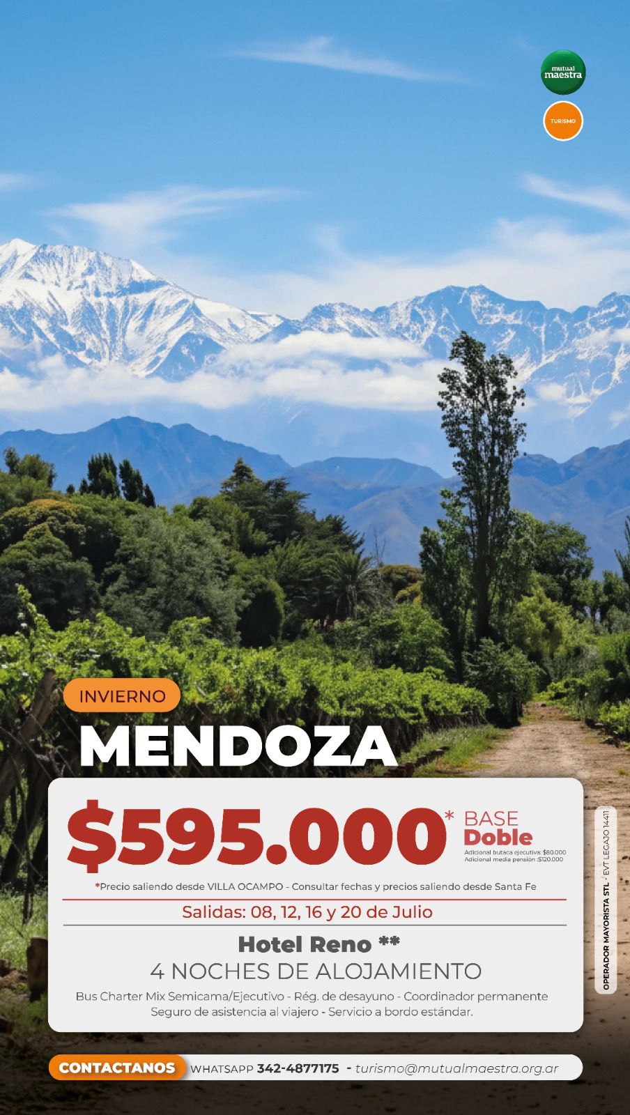 • OPCIONALES Alta montaña. Caminos del vino. Cañón del Atuel. Cordón del Plata. Termas de Cacheuta. Experiencia Vinos Alta Gama. Peña folklórica. No incluye entradas.