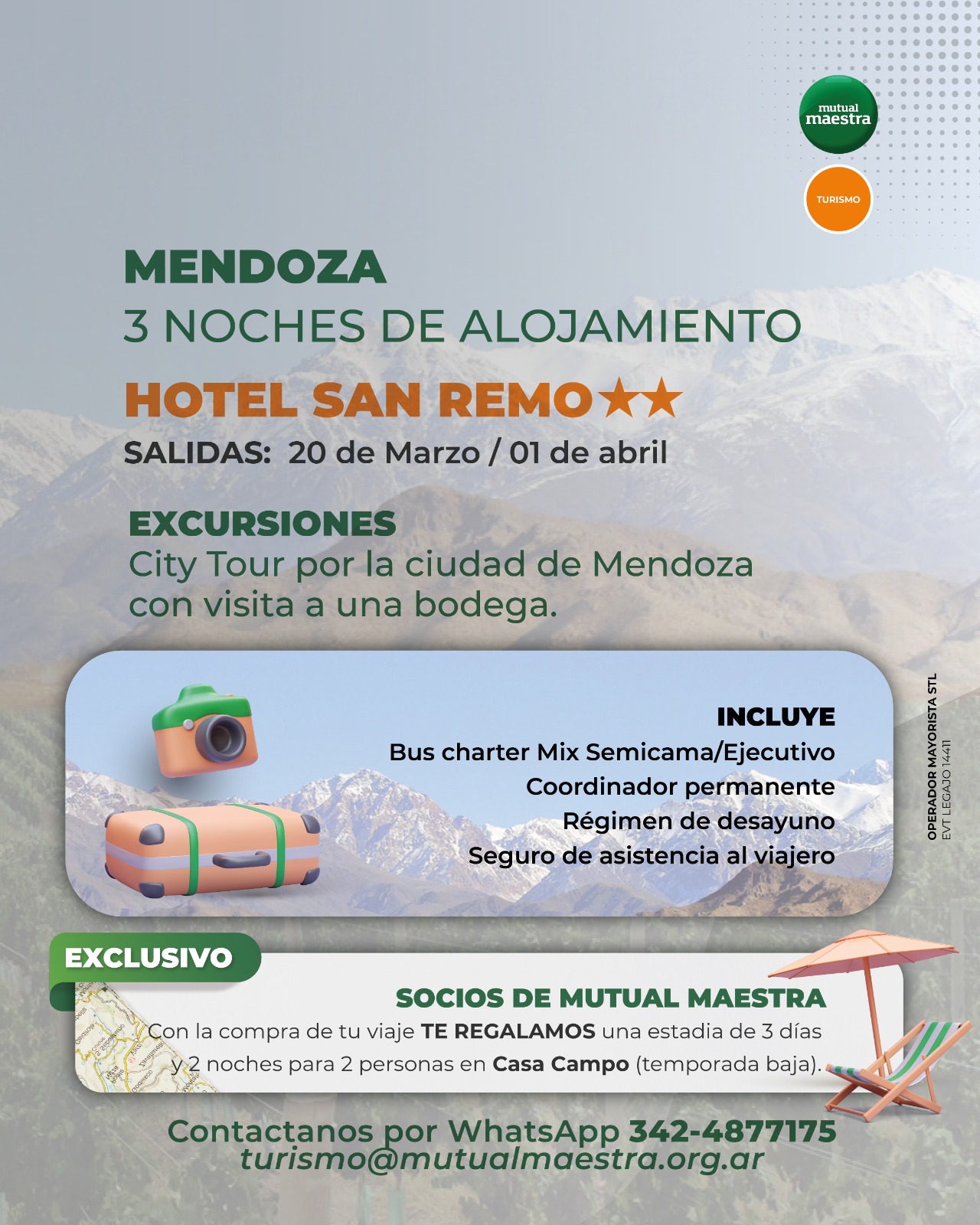 OPCIONALES Alta montaña. Caminos del vino. Cañón del Atuel. Cordón del Plata. Termas de Cacheuta. Experiencia Vinos Alta Gama. Peña folklórica. No incluye entradas.