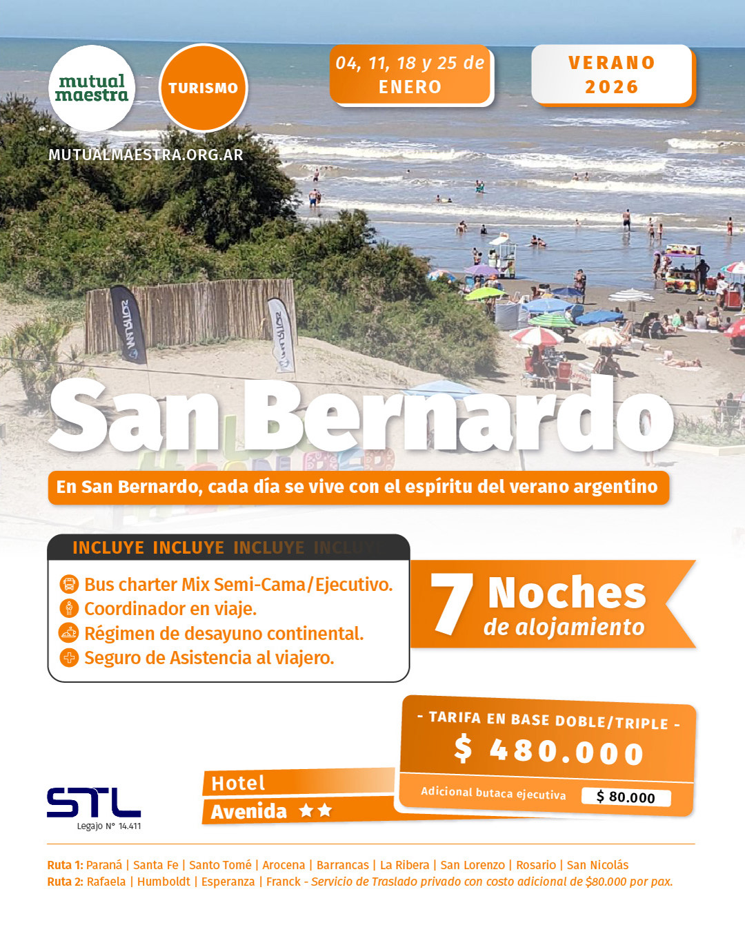San Bernardo te espera con su encanto costero, sus amplias playas doradas, y un ambiente familiar que combina relax y entretenimiento. Paseá por la animada Avenida Chiozza, disfrutá de su gastronomía local, y viví atardeceres inolvidables frente al mar. Ya sea para descansar o divertirte, San Bernardo tiene todo lo que buscás.